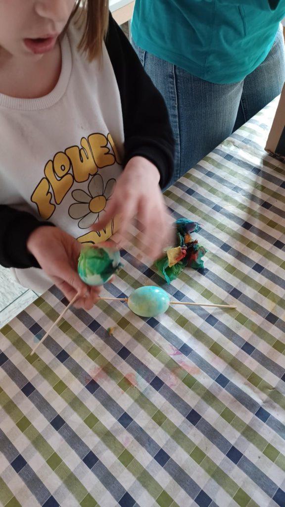 Ausgeblasene Eier wurden mit Krepppapier gefärbt.