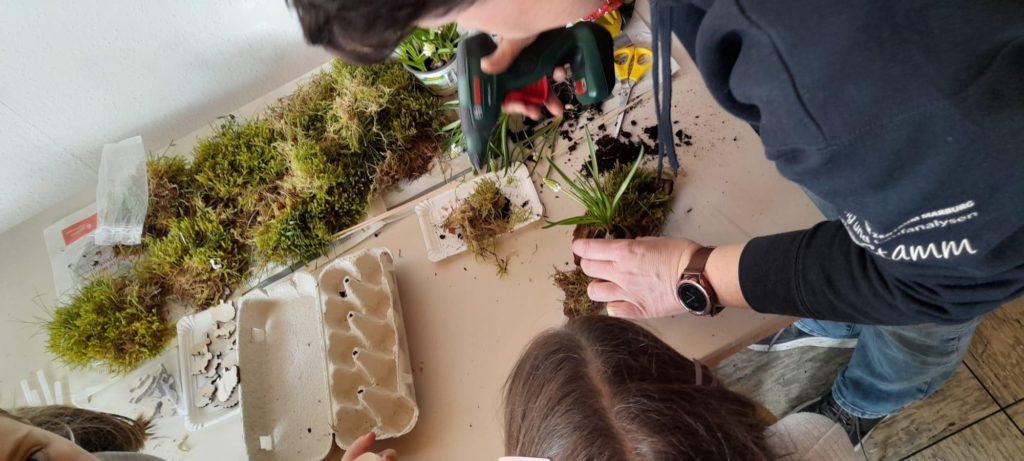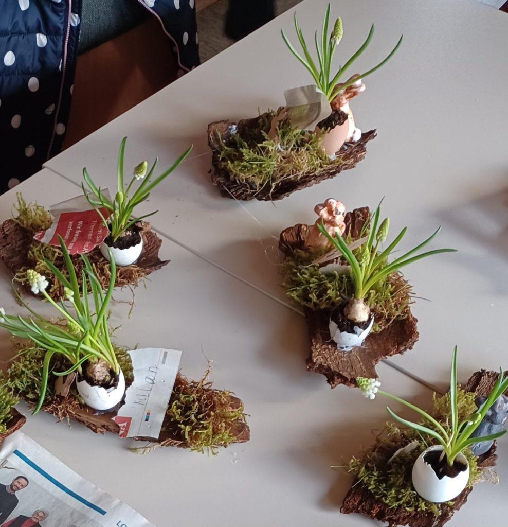 Aus Baumrinde, Moos, Eiern und Hasen haben die Kinder kleine Osternester gebaut.