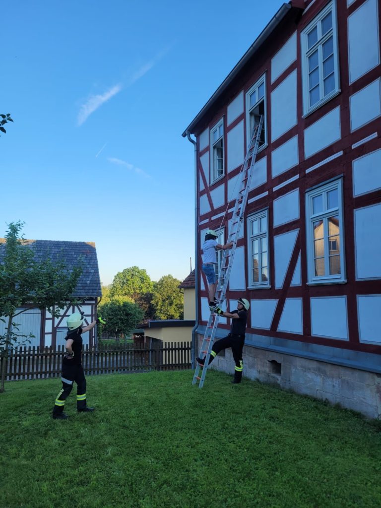Zum Abschluss des Übungsdienstes würde eine Übung zur Menschenrettung aus dem ersten OG eines Gebäudes durchgeführt.
