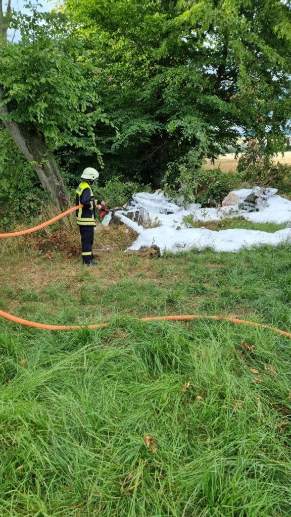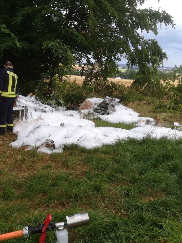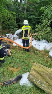 Aus diesem Grund wurde der zuständige Förster alarmiert und mit Hilfe eines Forstarbeiters der Baum gefällt und zerteilt. Jetzt konnte mit Hilfe von Schaumlöschmittel alle Brandherde gelöscht werden.