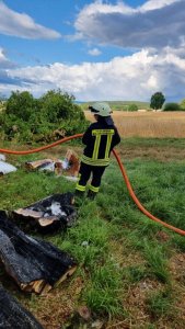 Da die Einsatzstelle weit abgelegen von der nächste Wasserquelle war, haben die Kameraden:innen aus Merzenhausen die Wasserversorgung durch einen Pendelverkehr der Einsatzfahrzeuge mit Wassertanks, sichergestellt.